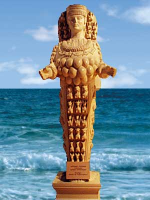 Copie d'une statue de la déesse Artémis d’Ephèse. Musée d’histoire de Marseille. Le corps est recouvert d’animaux, le buste de testicules de taureaux. Artémis est ainsi la protectrice des animaux et la déesse de la fertilité (1) |
