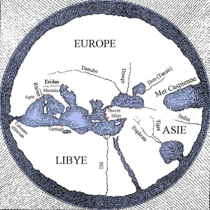 Concernant l’intérieur de l’Europe, au IV AC, c’est tout simplement l’ignorance totale. Les grecs, Phénitiens et Etrusques sont essentiellement des gens de mer, et bien qu’ils commercent avec les peuples « barbares », leurs explorations ne dépassent pas la bande côtière. C’est ainsi que le Danube est censé prendre sa source dans les Pyrénées ! L’Europe du nord est arrondie, et vient rejoindre les Indes. Toute la partie nord est inhabitée, car trop froide.