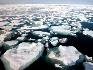 Le courant transporte les débris de la banquise qui s’est disloquée l’été, venant de l’extrême Nord. Les glaces sont très serrées, ce qui fait que la surface de la mer devient presque unie, simplement bercée par le rythme lent de la houle. C’est le pack.