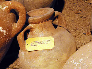 Amphores massaliotes. Massalia a développé ses propres formes d’amphores.Celles-ci sont plus arrondies et leur base est plate |